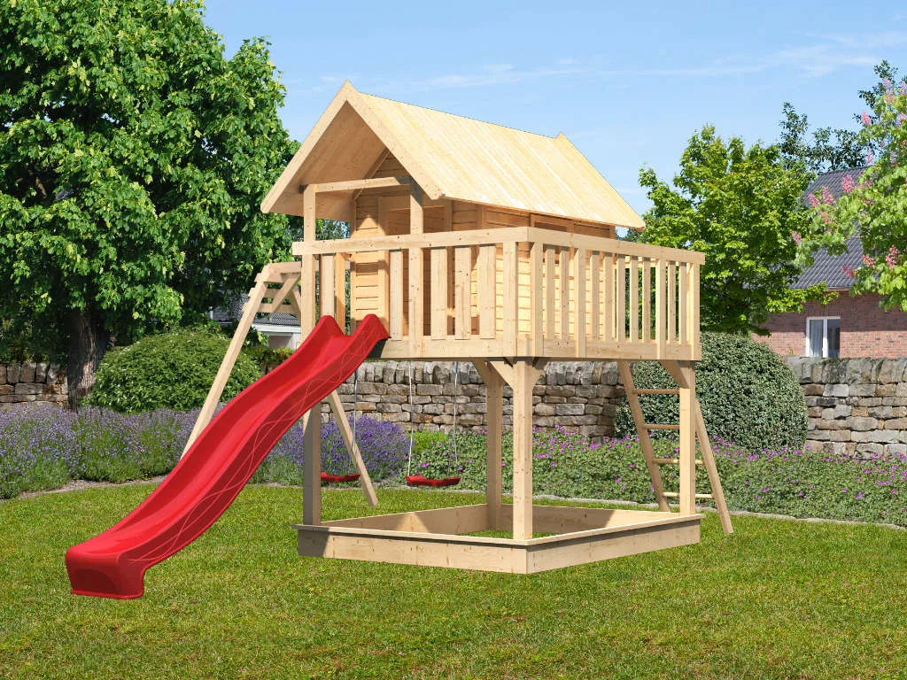 Dieser Spielturm ist aus Holz gefertigt. Der Naturstoff ist das perfekte Material für Kinderspielgeräte – strapazierfähig und beständig. Für die Herstellung wurde erstklassiges Fichtenholz verwendet. Fichte ist besonders langlebig und robust, was für die notwendige Stabilität sorgt.