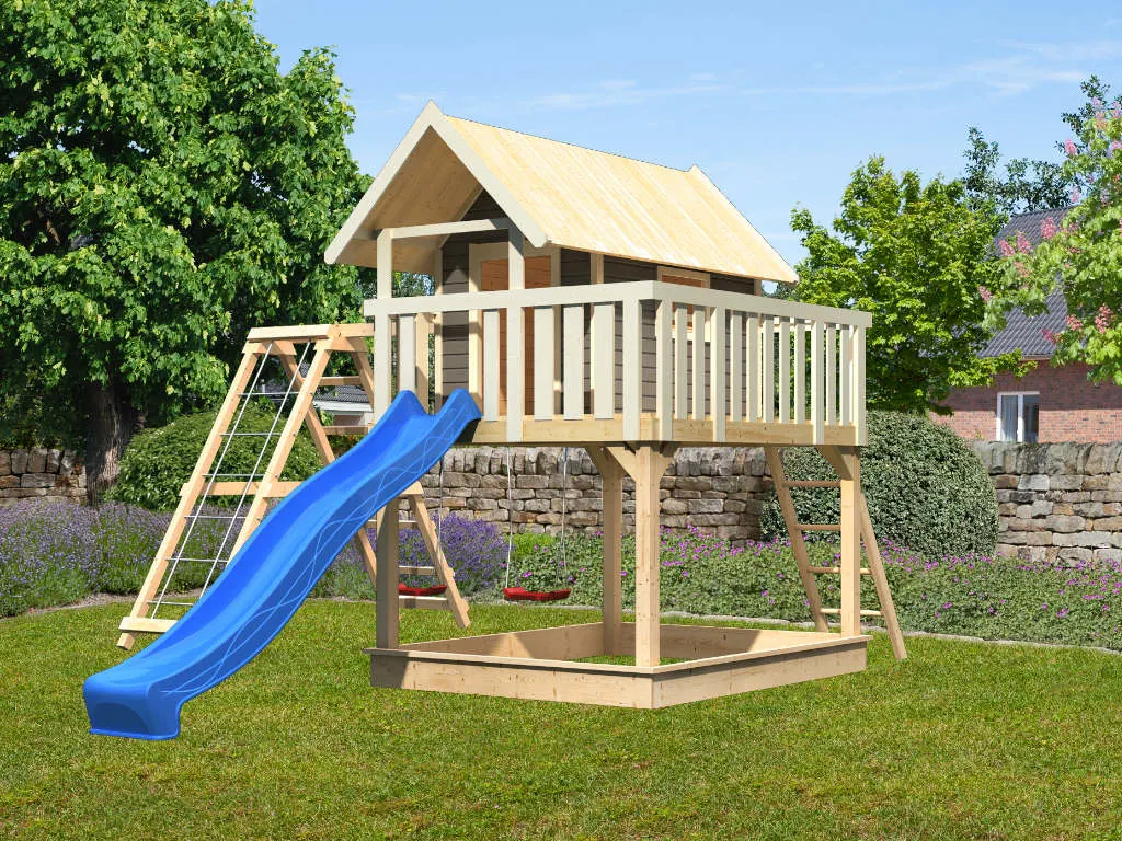 Nicht für Kinder unter 3 Jahren geeignet. Geeignet für Kinder von 3 bis 14 Jahren. Benutzung nur unter unmittelbarer Aufsicht von Erwachsenen. Stolper- und/oder Sturzgefahr. Nur für den häuslichen, privaten Bereich (DIN EN 71-8). Ausschließlich für die Verwendung im Freien. Spieltürme/Stelzenhäuser mit einer Spielhöhe von über 60 cm müssen auf einer weichen Unterlage wie Gras oder Holzspänen aufgestellt werden. Bei Spieltürmen/Stelzenhäusern mit einer Spielhöhe unter 60 cm wird eine weiche Unterlage ebenfalls empfohlen. Die Grundkonstruktion ist in regelmäßigen Abständen auf etwaige Beschädigung und Fäulnisbefall zu kontrollieren. Um die Stabilität zu gewährleisten, müssen die Pfosten im Boden verankert werden. Die Schraubverbindungen sind in regelmäßigen Abständen (ca. 4 Wochen, je nach Benutzungshäufigkeit und Alter des Spielgerätes) auf festen Sitz und Stabilität zu überprüfen. Die angegebenen Maße können geringfügig abweichen.
