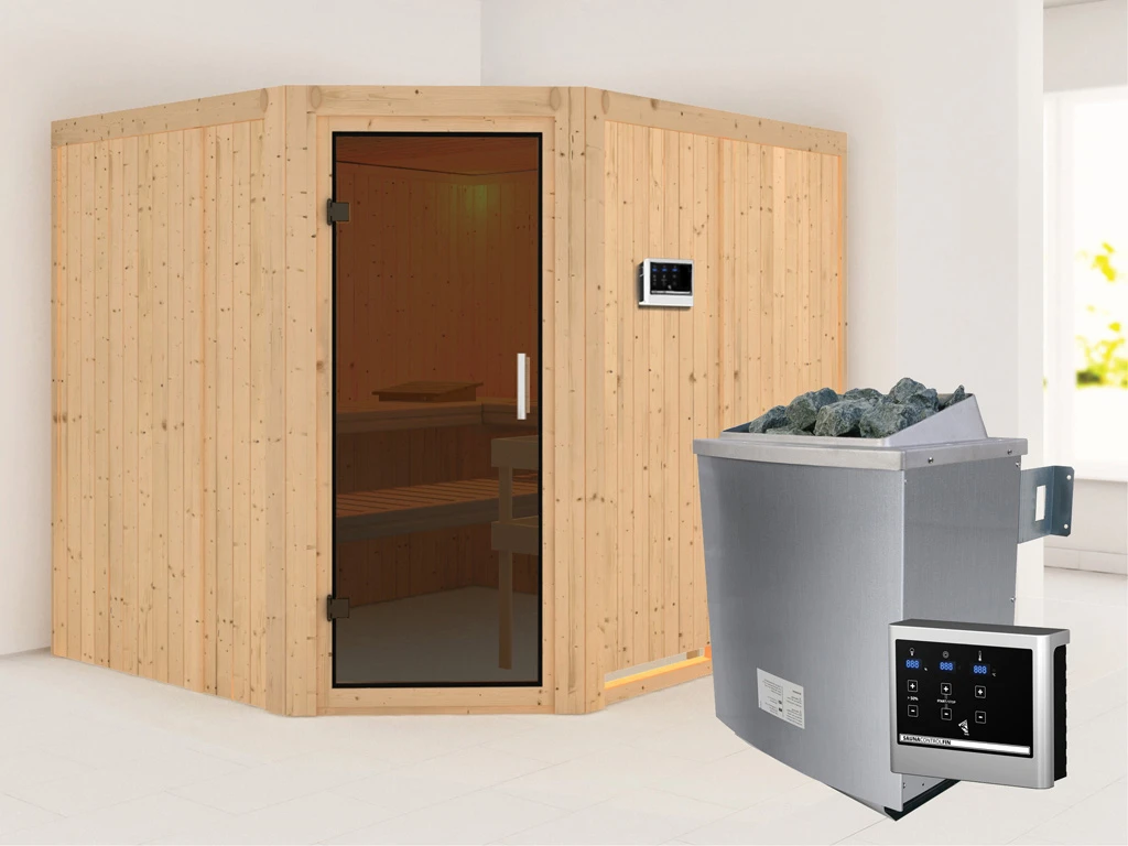 Bei dieser Innensauna ist ein Saunaofen mit einer externen Steuerung inklusive. Das Steuergerät wird außerhalb der Sauna angebracht. Auf diese Weise fängt schon vor dem Saunieren der Komfort an – mit einer bequemen Bedienung von außen und einer noch exakteren Temperatureinstellung. Weitere elektrische Geräte, wie die Kabinenbeleuchtung, können ebenso an die externe Steuerung angeschlossen und bedient werden.